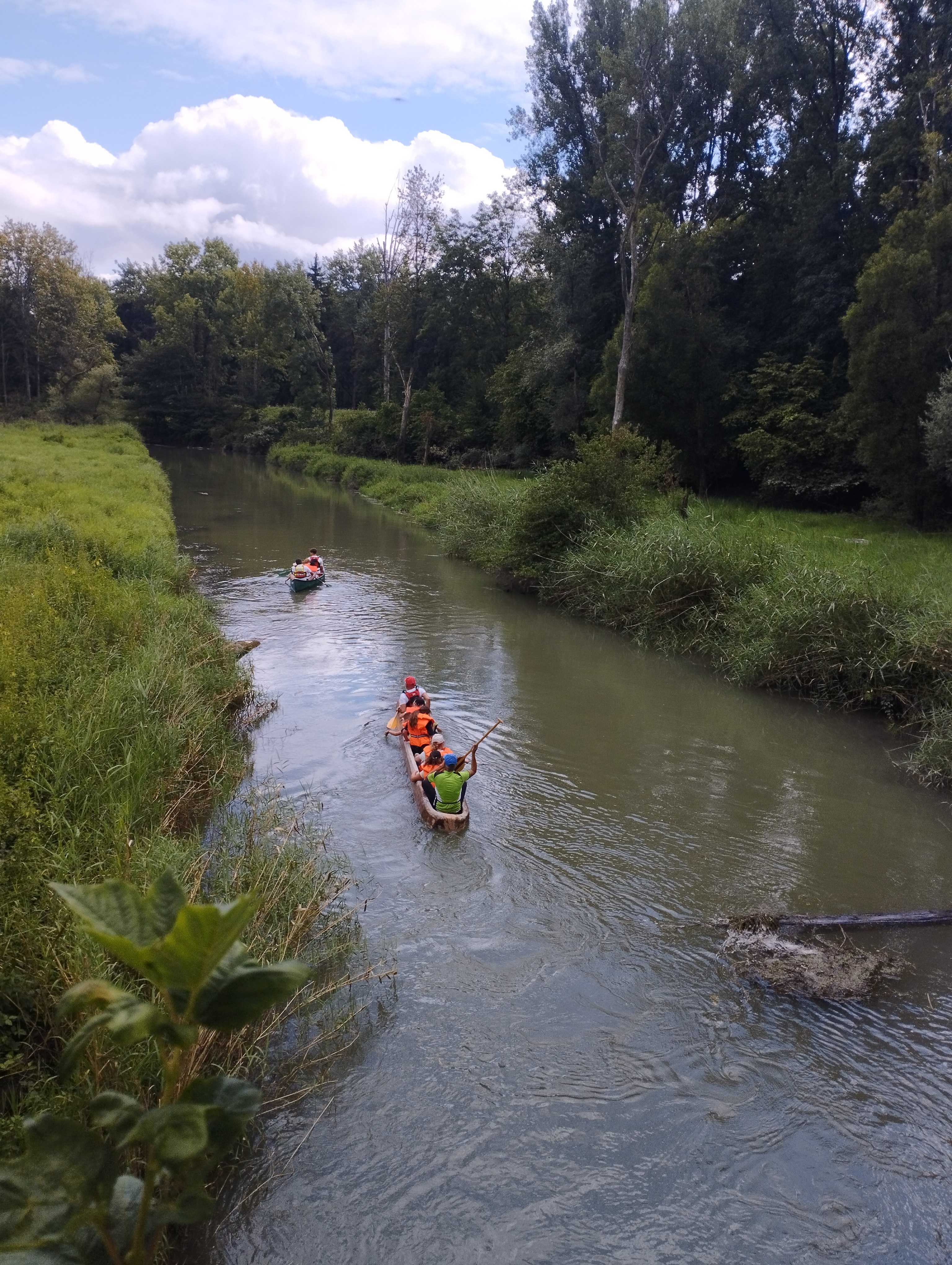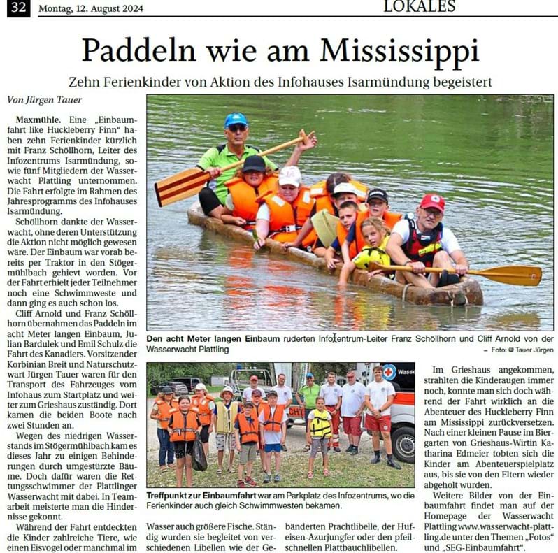 Im Rahmen des Ferienprogramms fand auch diesen Sommer wieder die Einbaumfahrt vom Infozentrum Isarmündung zum Grieshaus statt. Teilweise mussten schwierige Stellen passiert werden. Sogar ein Baum lag quer im Wasser. Dank des Begleittrupps von der Wasserwacht Plattling wurde dies erst gar nicht zum Problem. Die Rettungsschwimmer sprangen ins Wasser und räumten den Baum zur Seite. Die Kinder fanden das bestimmt sehr spannend. Auch konnten die Kinder den Eisvogel und größere Fische sowie besonders schöne Libellen, wie die Gebänderte Prachtlibelle, die Hufeisen-Azurjungfer sowie die Plattbauchlibellen beobachten. Begleitet von den Libellen erreichte die Gruppe das Ziel am Grieshaus.